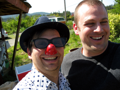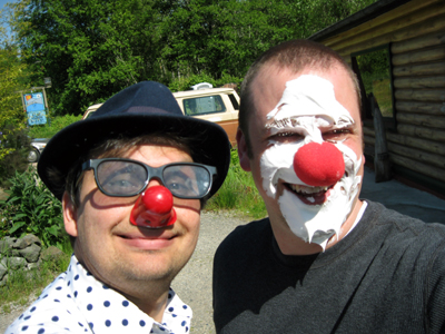 I decided on a fair weather ensemble: blue swim trunks, polka dotted shirt, red cummerbund, and the new blue fedora. I brought the nose along for the pieing.