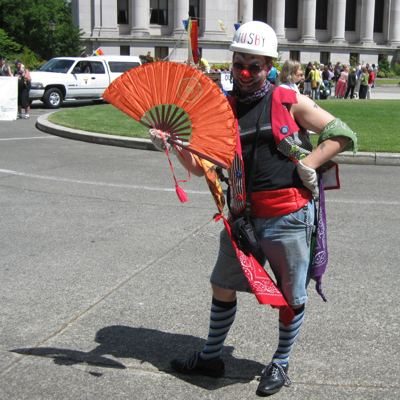I just got back from a wonderfully P event (that stands for Pretty). I got to stretch my character and apparel to fit in. I bought three more bandannas to have a Rainbow Colored Bandanna Boa. I also branded my old Construction Helmet with a black and red Sharpie.