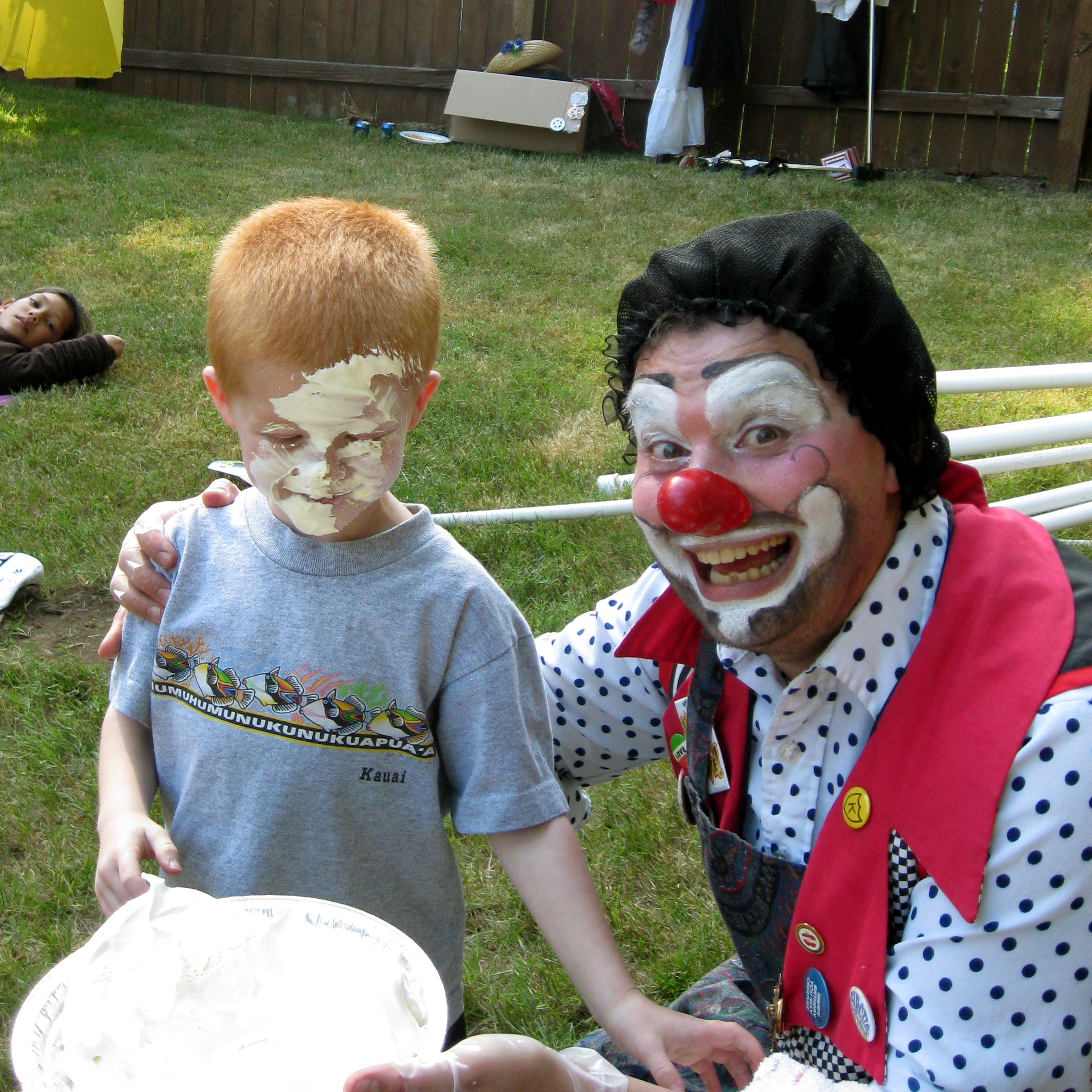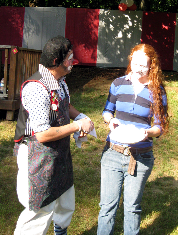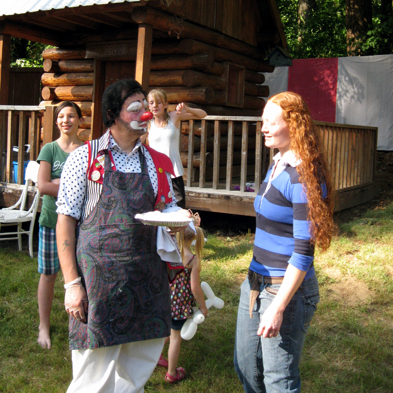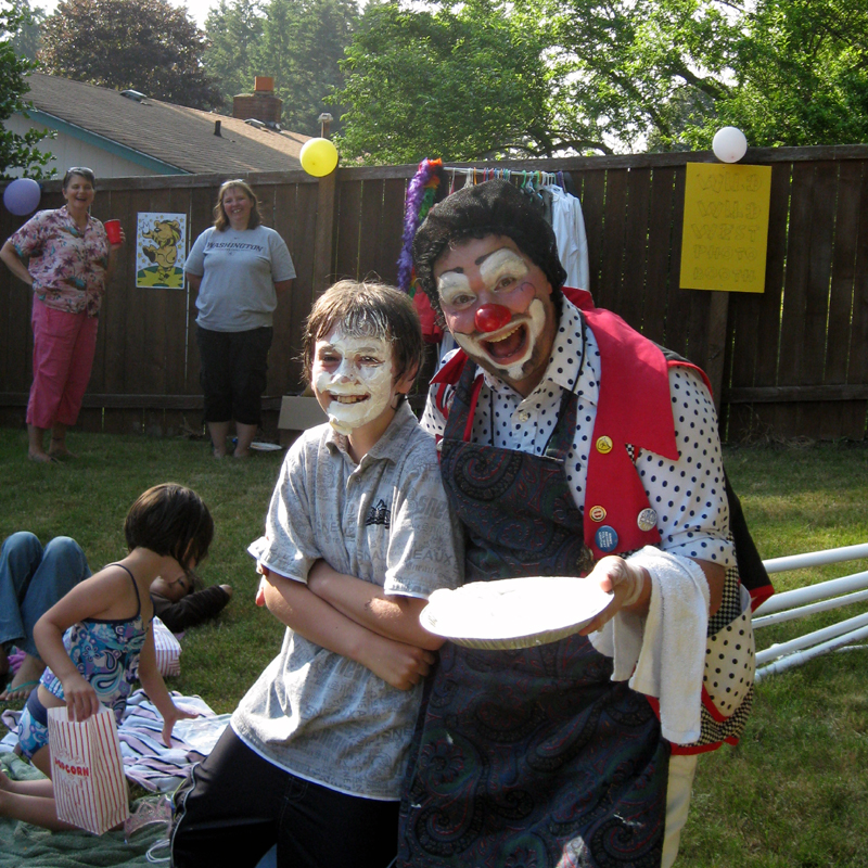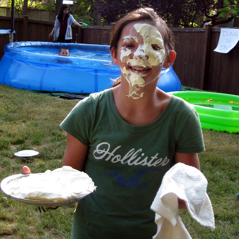 In addition to the pie-ings, they had a giant back yard filled with activities including TWO pools and a Trampoline. All around the perimeter were activities like Pop the Balloon with a Dart, Cardboard Bumper Cars, Ring Toss, Western Dress-Up Photo, a Hamburger/ Hot Dog Stand with Cotton Candy, Popcorn, Etc. Etc. Etc.!