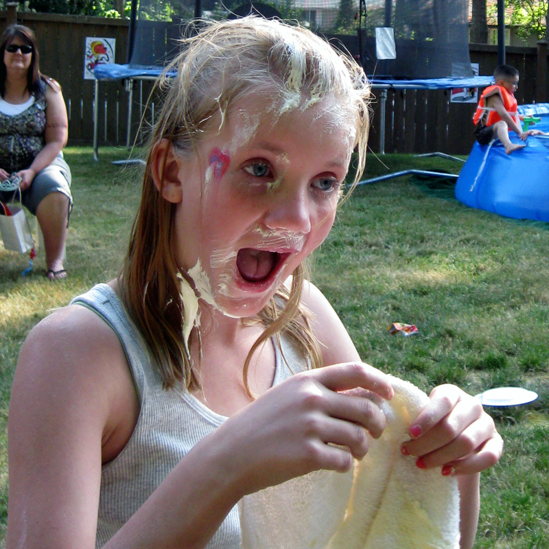 Then… I brought out the new dispenser… and it FAILED again! Gas hissed out the side and, when dispensed, shot everywhere. So I just splattered around toward adults. We gave it to the birthday girl, and she wouldn’t put it in dad’s face. Good girl!