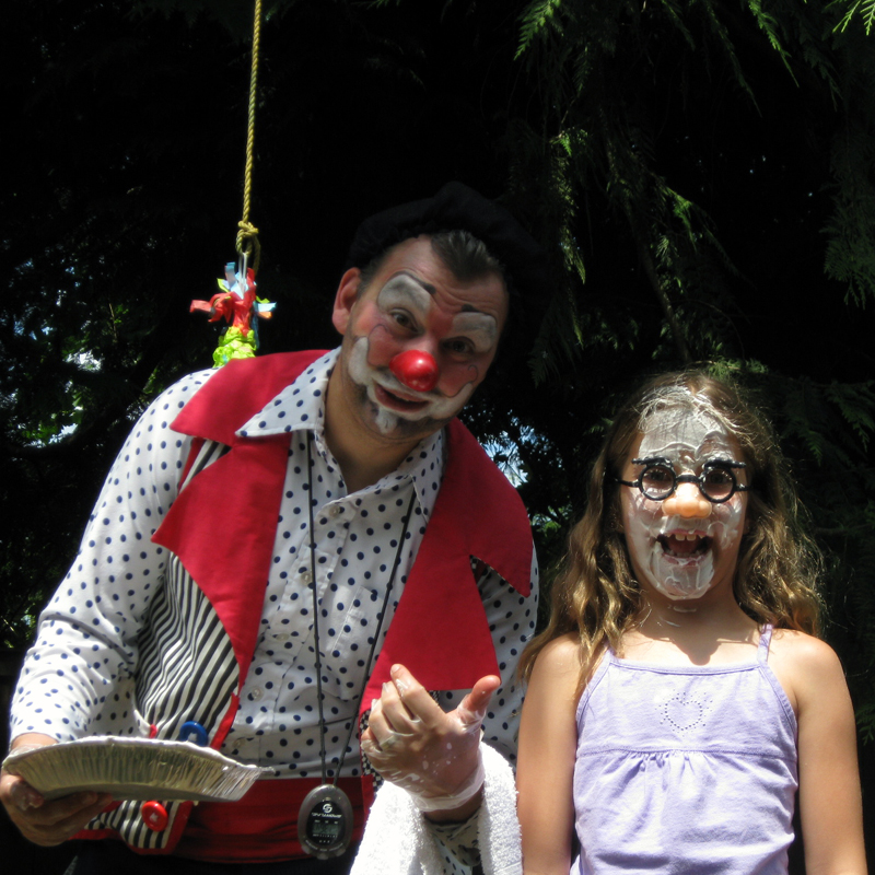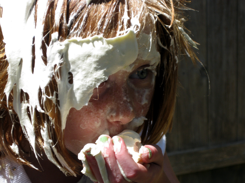 Even though Kallie had been pied at Tristen’s party a few months ago, she was still keen on getting pied at her own birthday. In fact, she wanted the whipped cream all through her hair and everywhere… going back for a second pie after every one had theirs. She knew about the red clown nose I sometimes use and had a suitable substitute in the form of Groucho glasses!