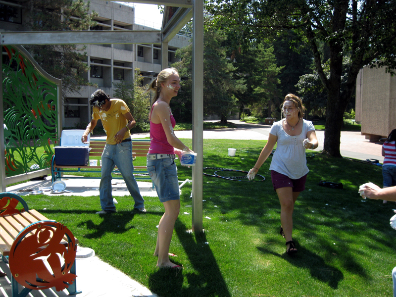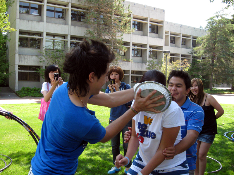 Which almost brings me to the pie-fest portion… first I did an abbreviated indoor show on the stage of the Lecture Hall, featuring an assortment of my usual tricks but also introducing my new baby Orangutan puppet for a mini-lesson on the Indonesian language. [Orang-Utan means Person of the Jungle. Orang-Utang means Person in Debt. “Like You” sayeth the puppet] All those who had signed the waiver were called up on stage and made to perform as a human machine. Then we sat them down and showed them the Pie Delivery page of my website on the big screen.