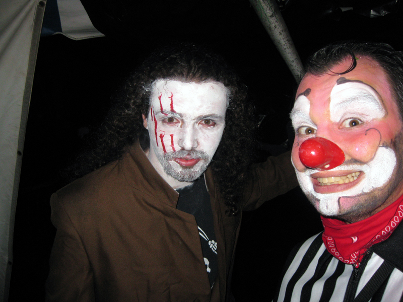 At half past seven (or quarter ’til eight) Jusby made his appearance as the clown referee/ tour guide for the Tumwater Halloween House. New props and new actors had been added, but the main difference in Friday’s performance was the intense wind and rain. Although it was relatively dry within the black plastic maze, the doors and edges kept getting blown open, and I still had to guide people to and from the rainy open yard areas.