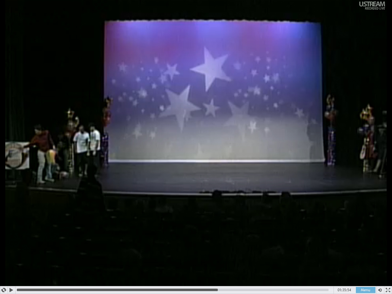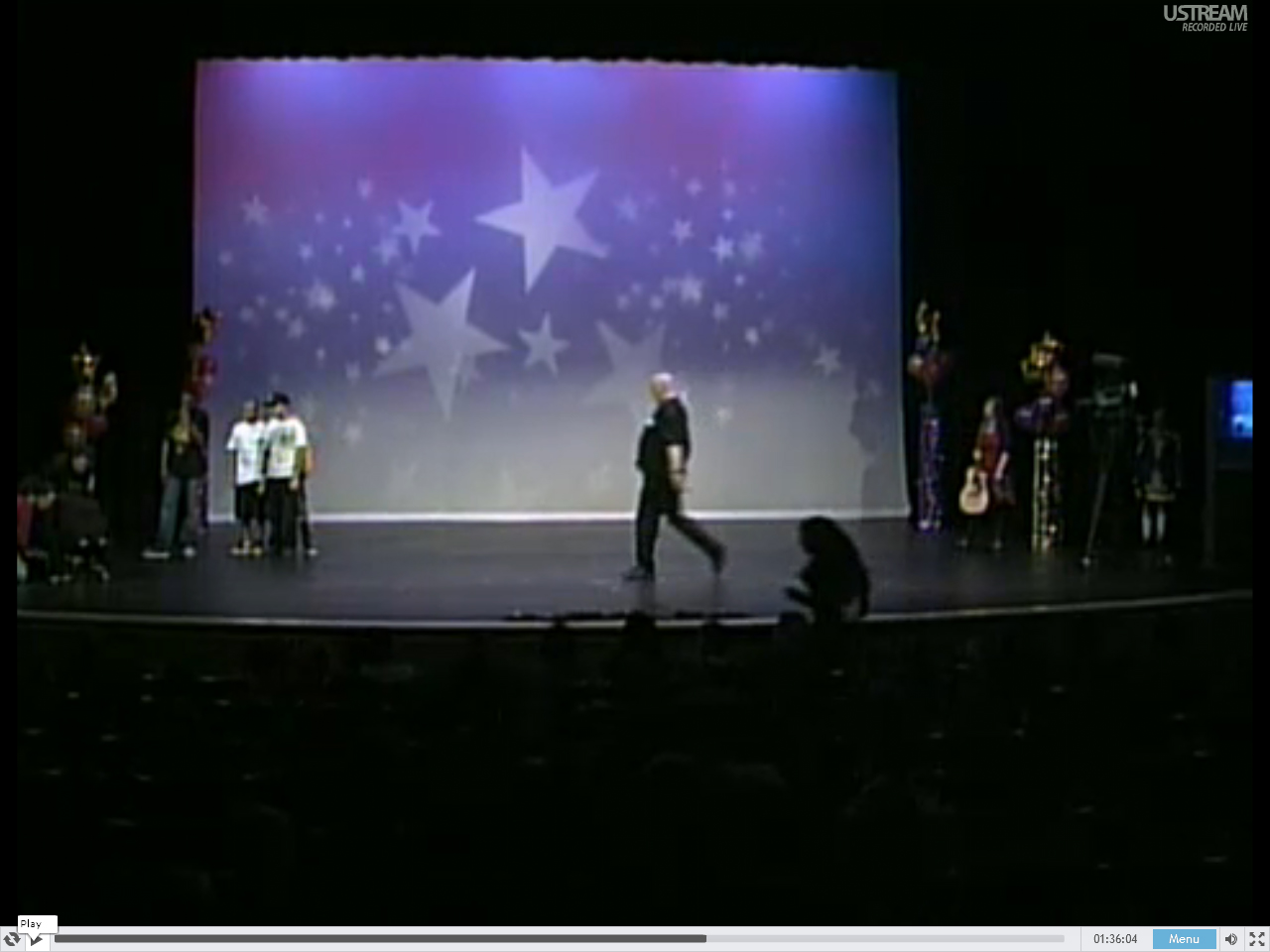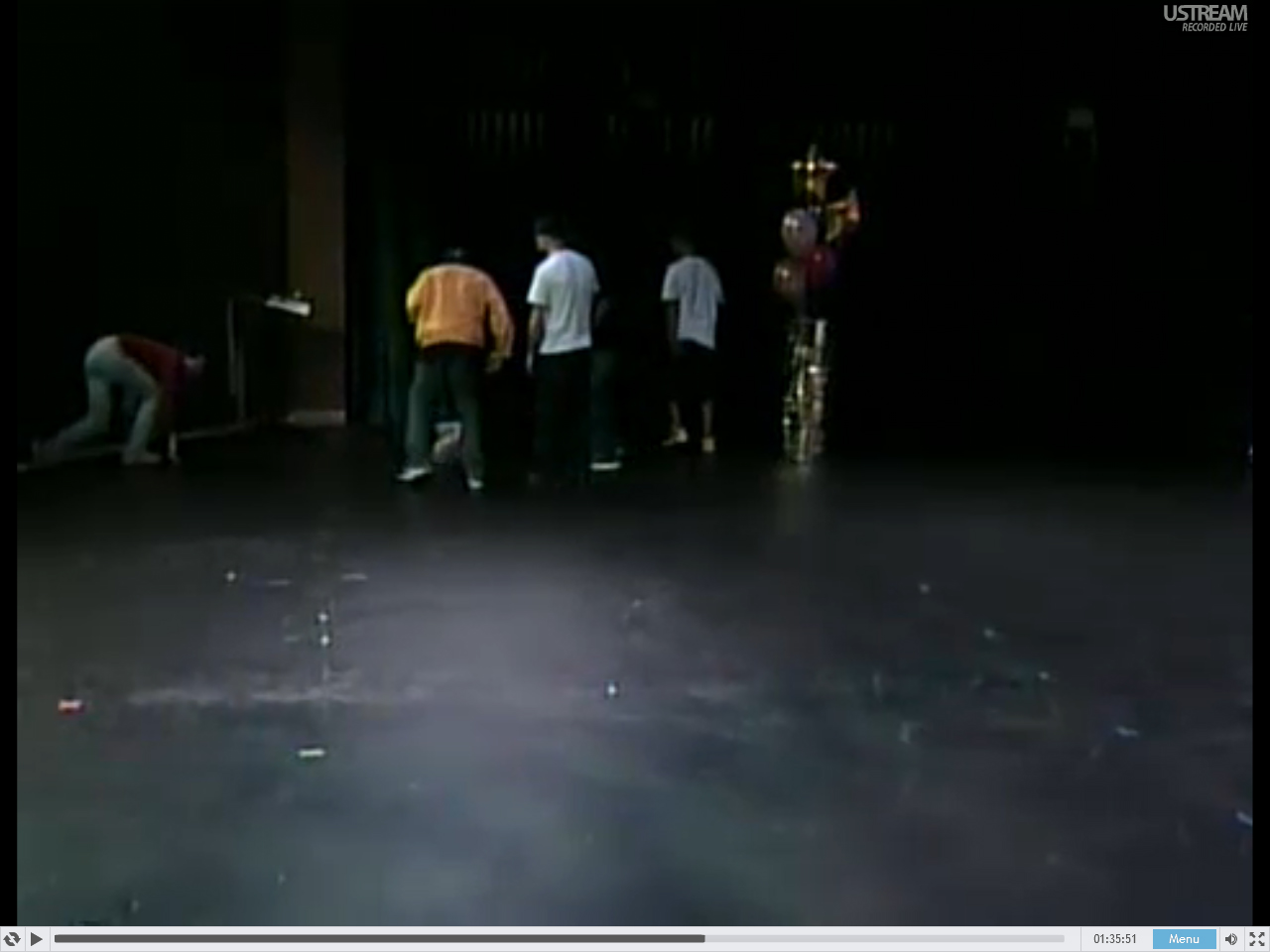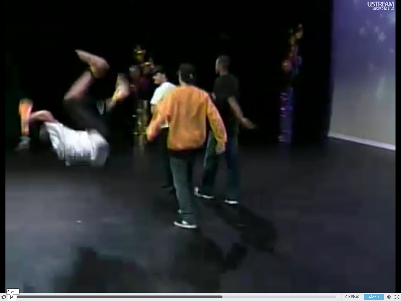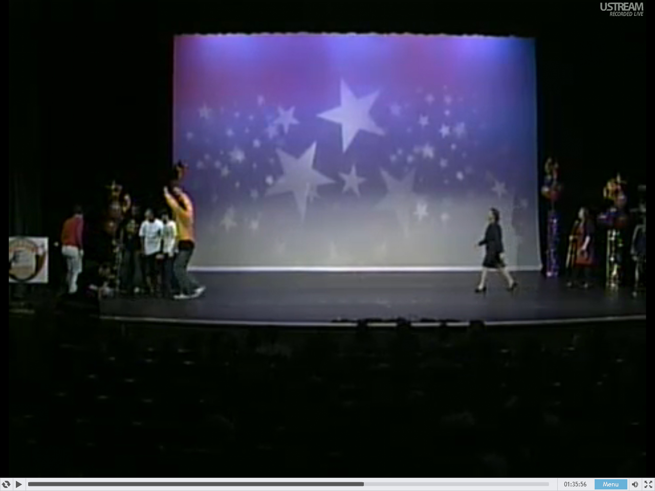 [1:35:56] Deb starts walking across the stage. A b-boy is backing up with his hands in the air! Like WTF, I didn’t touch him!