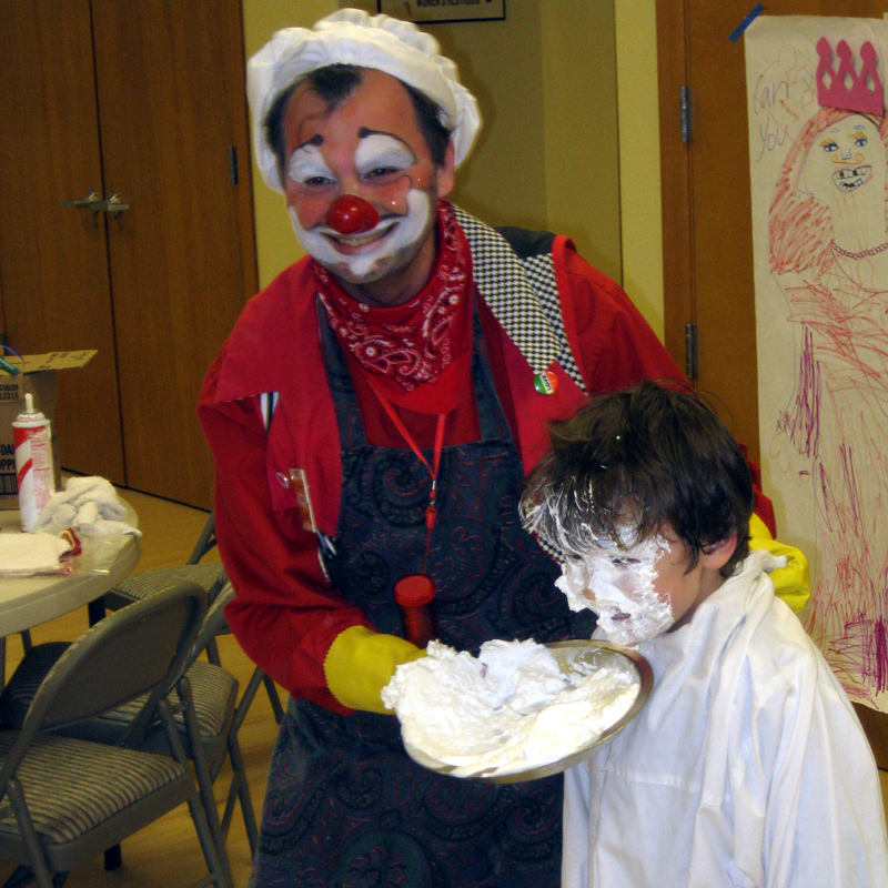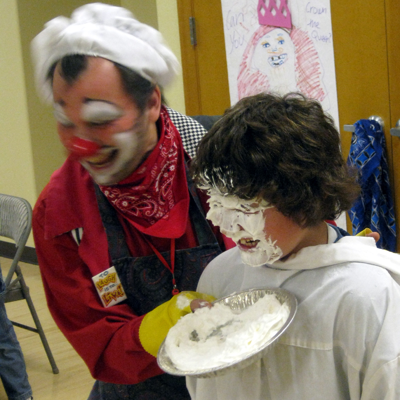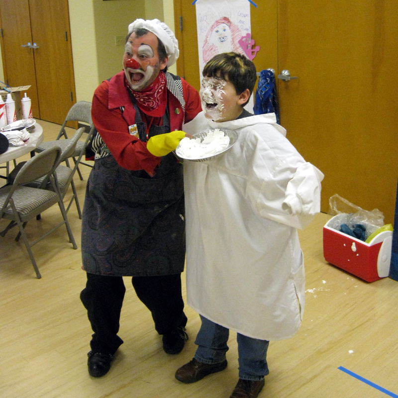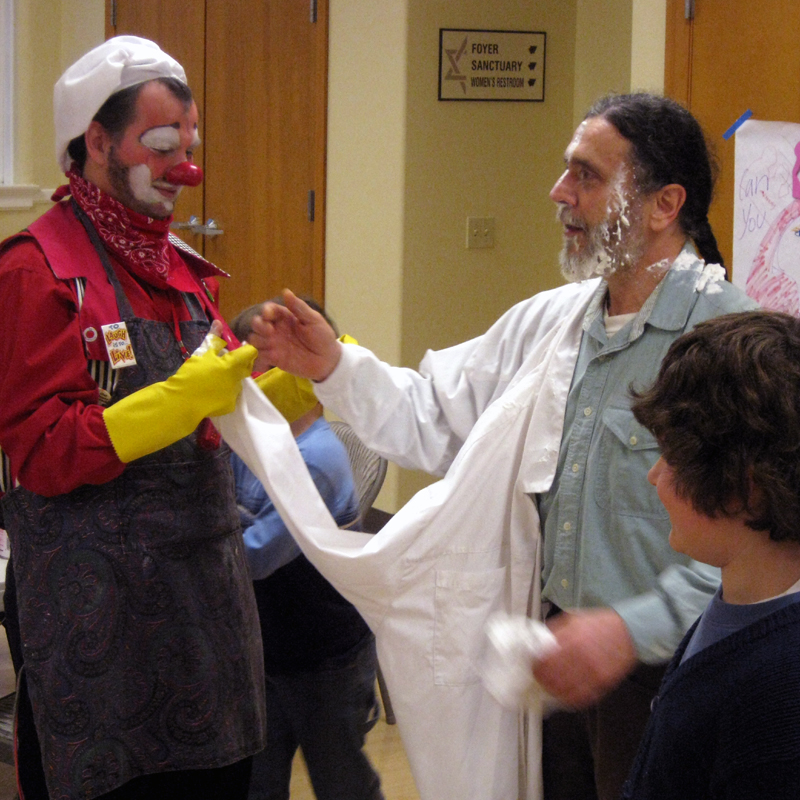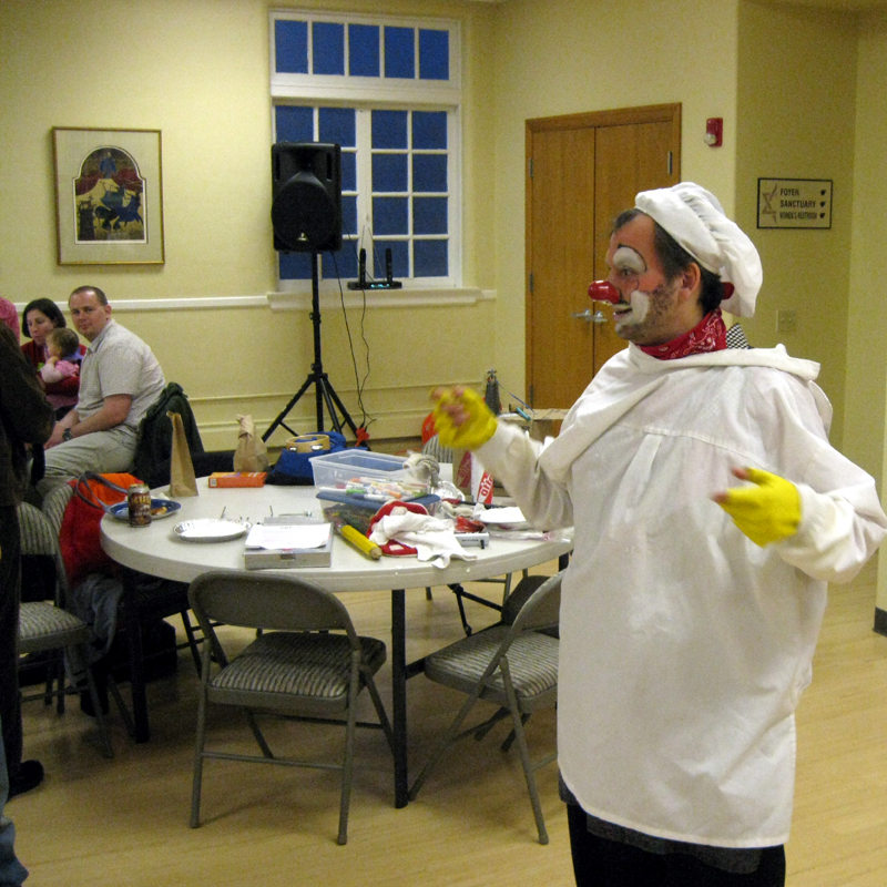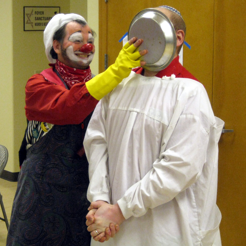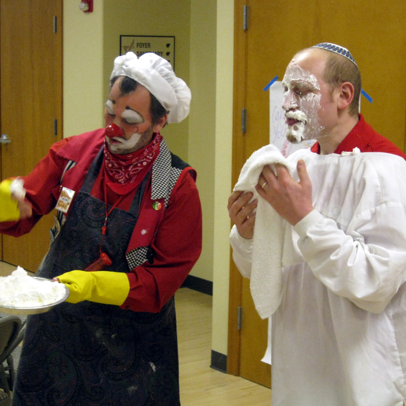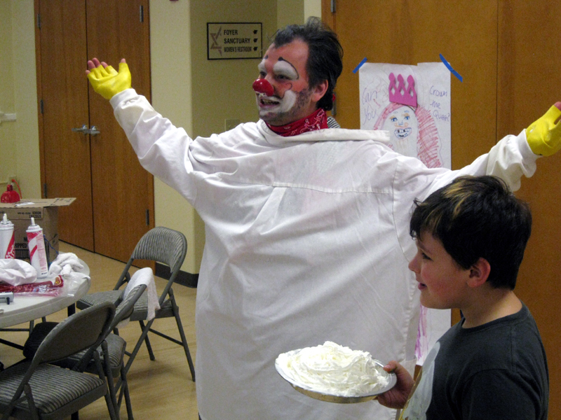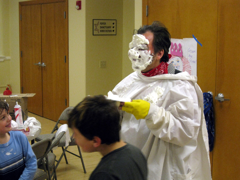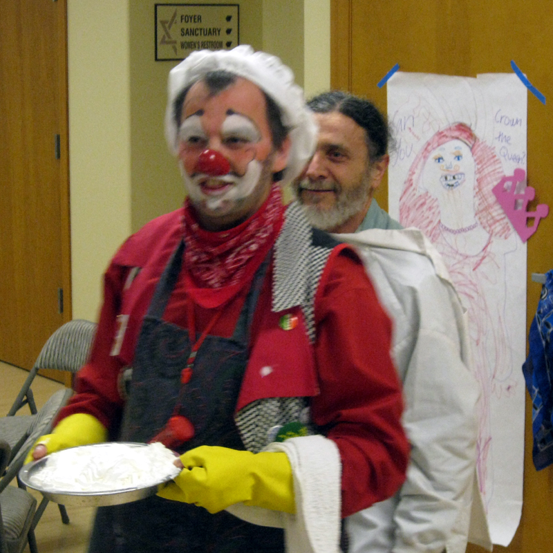 On a tip from some pro-clowns, I started thinking about pitching my services to the Temple Beth Hatfiloh for their Purim Carnival. Then an old-school friend, Ozi, asked me if I was going to do more pies at Arts Walk. I told him that I didn’t make any money doing Arts Walk, but what I really wanted was to do pie-in-the-face at Purim and could he talk to the Rabbi. He said, “He’s my dad.”