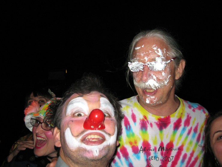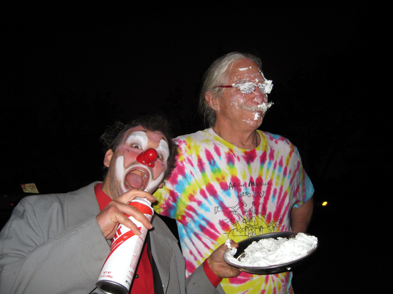 We arrived at the Fremont Studios for Patch Adam’s birthday party celebration at about 9 PM and found him strolling outside for a break of some sort. I sprung into action, and he graciously stood still for it while I waived the usual speechifying and simply presented the pie-in-the-face.