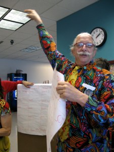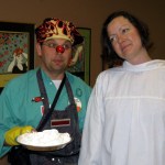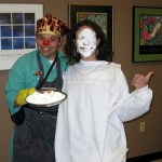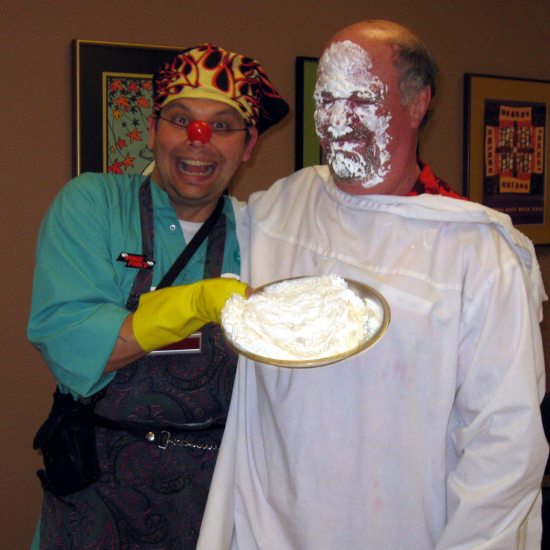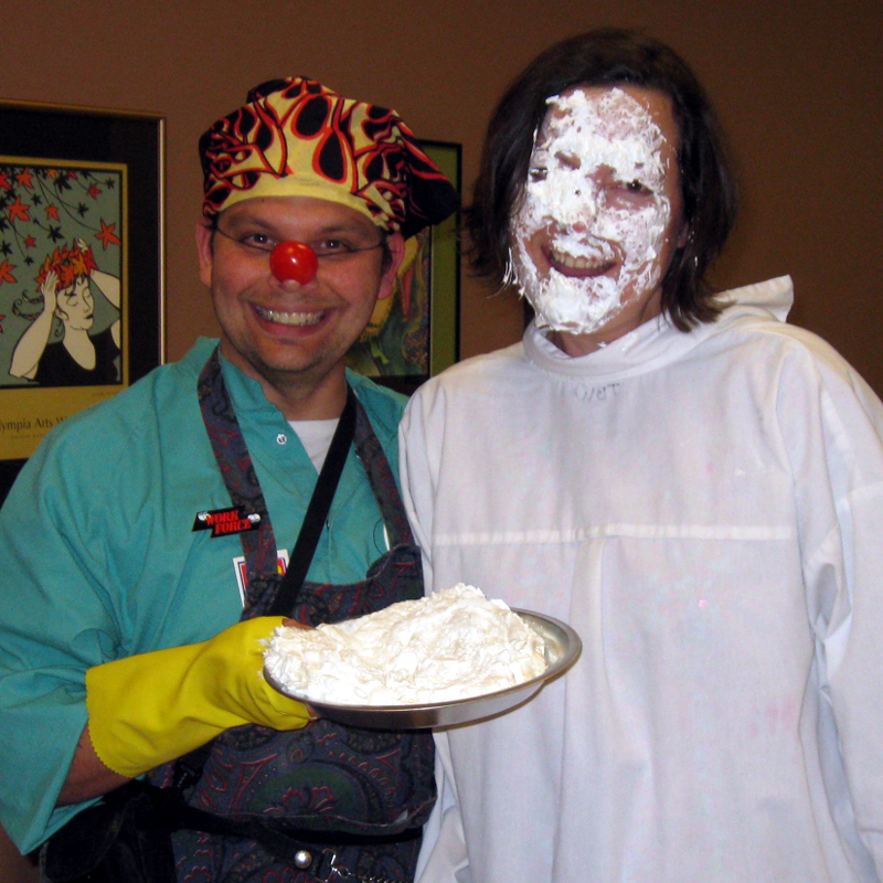 Here’s Phil Emerson getting pied. He initially wanted to waive the smock and leave his glasses on, but later appreciated our precautions.