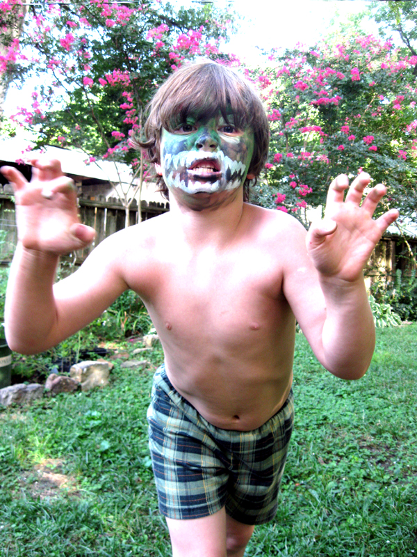 There’s the full effect with custom cut offs, pirate store socks, and only slightly too big Turf King garden slippers.