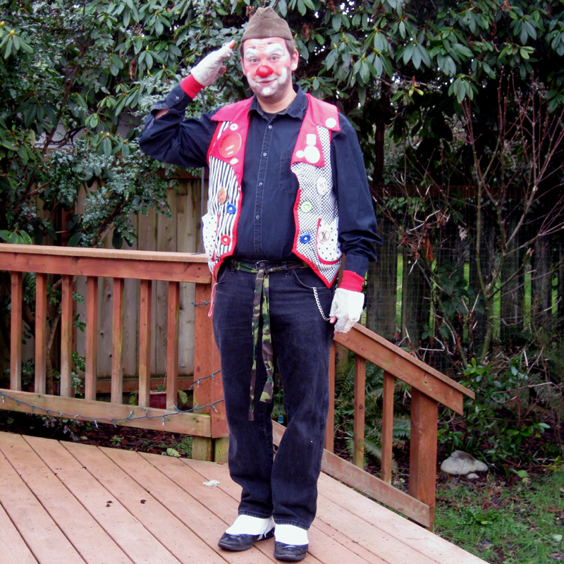 I went with the basic black topped with Grampa Del’s garrison cap, accented with a camouflaged belt from a long gone bathrobe. For extra fancy, I added the spats that came from Puck F.
