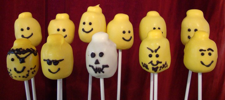 Lego Brick Cake from Cakeitecture. She also makes Cake Pops (Frosted Doughnut Hole on a Stick) in the form of minifig heads.