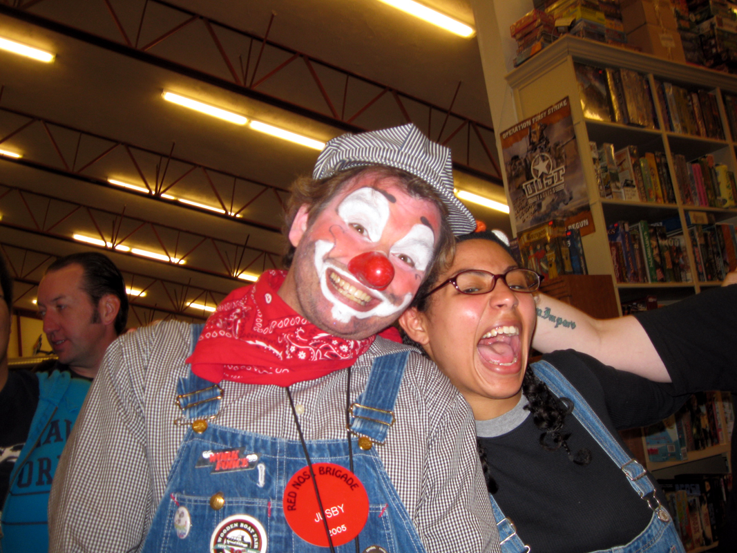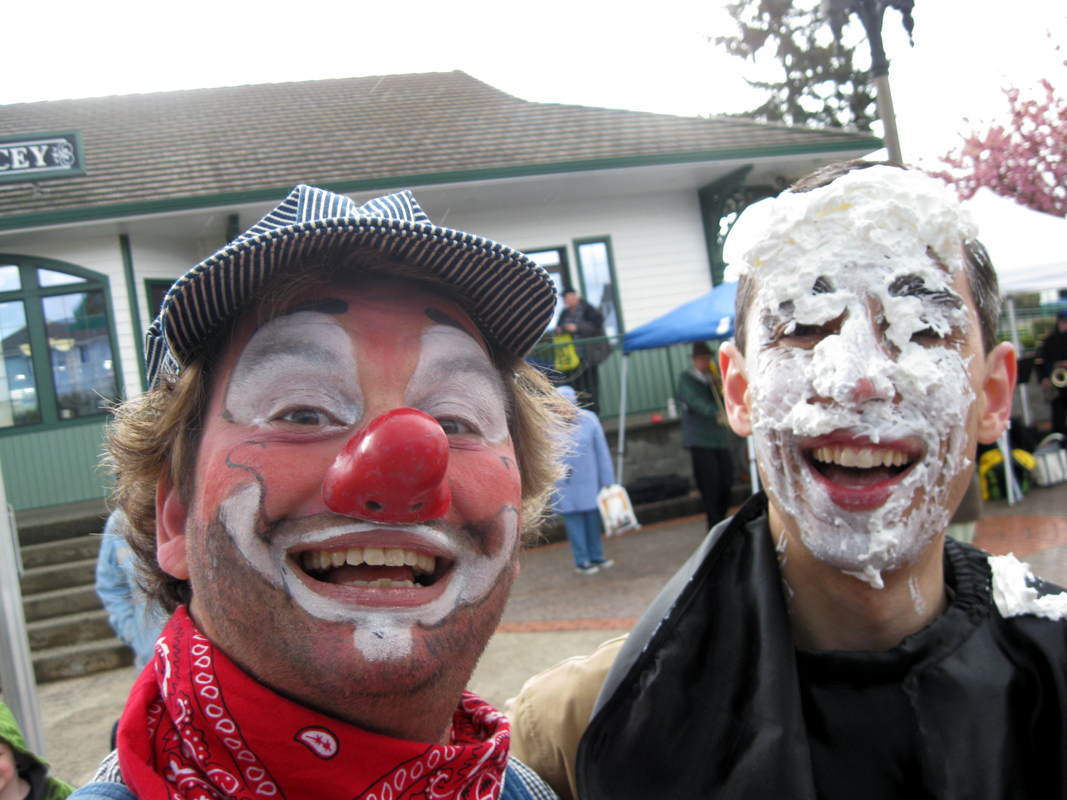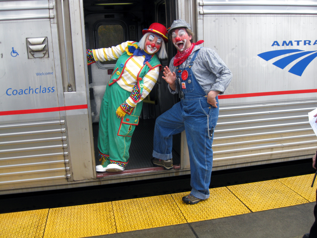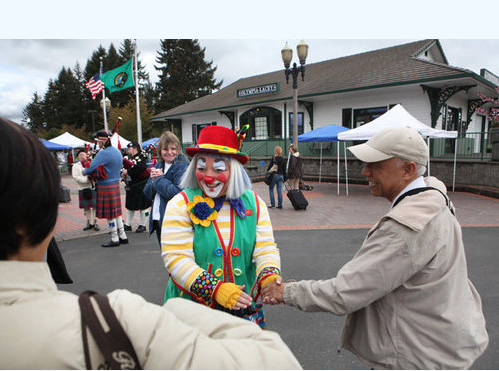 Sprouts the Clown greets Nancy and Fredrick Gomes of Vancouver, B.C., as they arrive for a family visit at the Olympia-Lacey Centennial Station during National Train Day celebration on Saturday, May 7, 2011. Sprouts, played by Jenni Hatfield of Lacey, is a member of the Red Nose Brigade clown troupe. (Tony Overman/Staff Photographer)