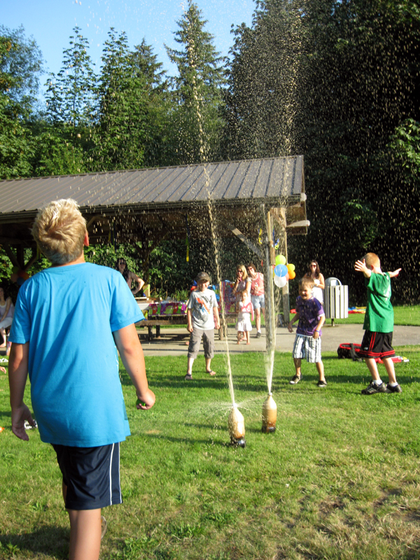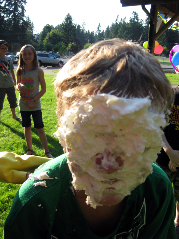 Then I rushed home to get into clown and gather supplies [pies, Coke & Mentos, and water balloons]. I had a previously booked party for that evening. The client had called Marie from Sustainable South Sound asking whether I would extend my coupon from last year. She was especially excited when I further offered to bring Crystal as a Buy One Get One special.