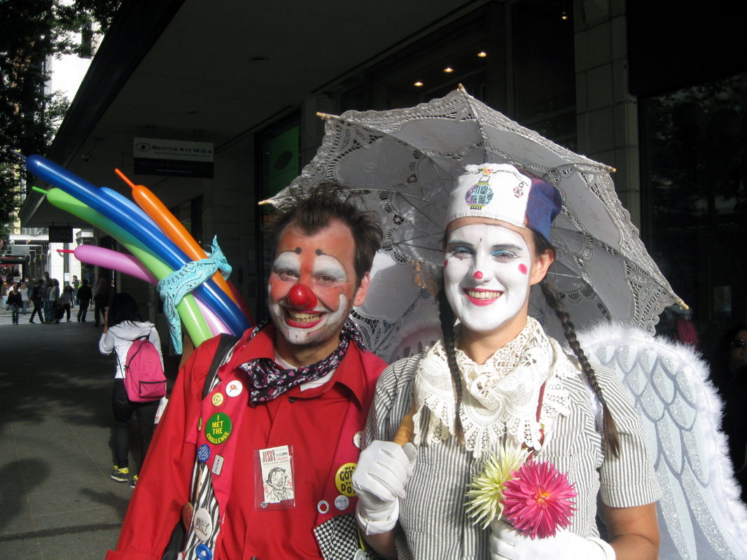 When the Go Game contacted me this time, I invited Honey the clown along. Not only does she drive a fuel efficient Prius, but she had some clever ideas about parking that would save me from paying $20 to park right next to the rendezvous spot. She said that we could park in Queen Anne and take a bus.