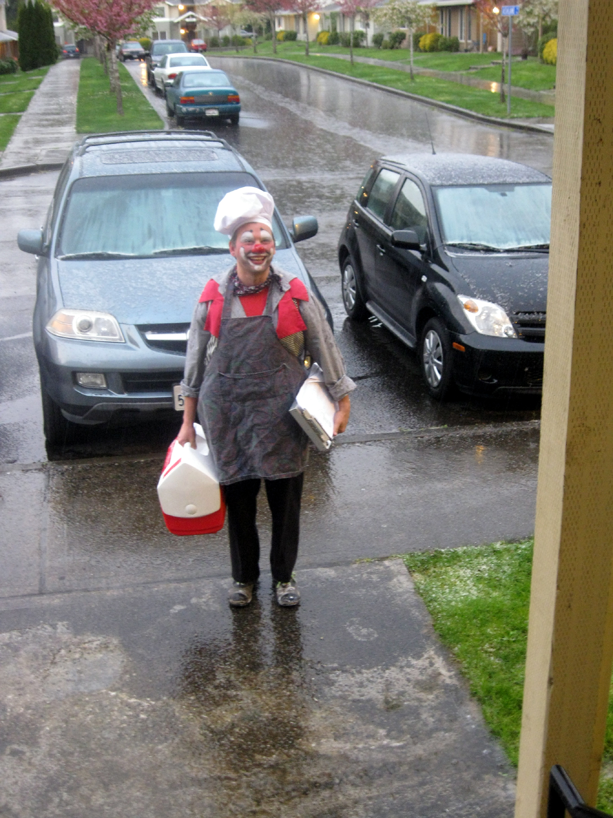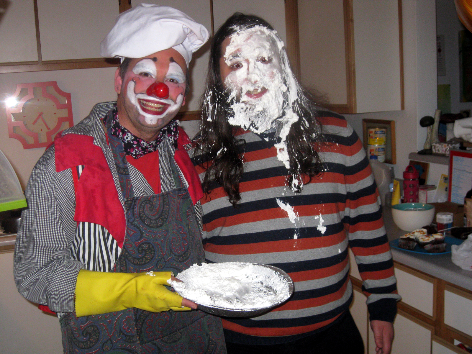 I got a call around 11 AM from California. A mom’s travel plans had fallen through, so she was looking to surprise her son with a pie-in-the-face delivery that evening. She used to plan elaborate theme parties for him, so when he had heard the news he remarked, “You’re not coming? What, no clown either?”.
